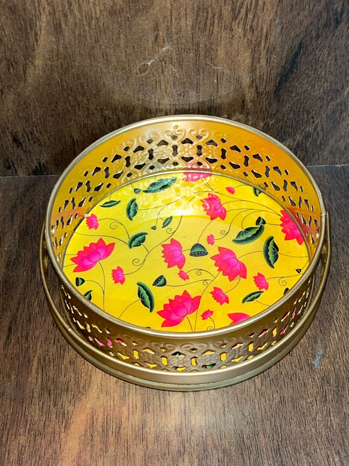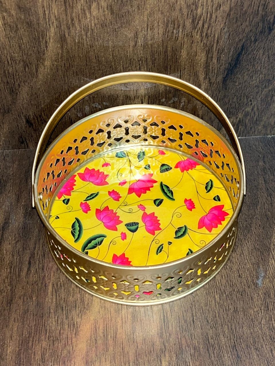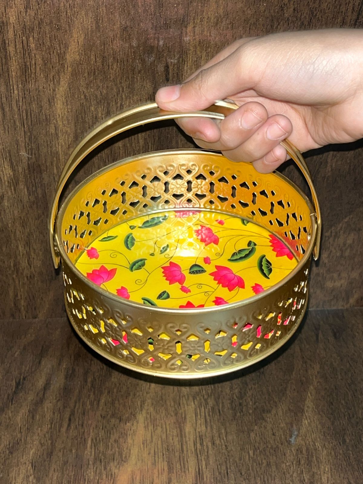 Add a touch of traditional charm to your home with this exquisite round metal basket. Crafted with a beautiful golden finish, this basket features intricate cut-out designs along its circumference, creating a delicate and elegant look. The highlight is the vibrant yellow base adorned with a stunning floral pattern, showcasing blooming pink flowers and green leaves. This basket is not only visually appealing but also practical, featuring a sturdy handle for easy carrying. It’s perfect for gifting sweets, dry fruits, or decorative items during festive occasions, or simply as a stylish accent piece for your home decor. Made with high-quality metal, this basket is durable and long-lasting. Its unique design and vibrant colors make it a standout piece that will enhance any setting. Ideal for Diwali gifts, wedding favors, or as a decorative tray for your living room or dining area.